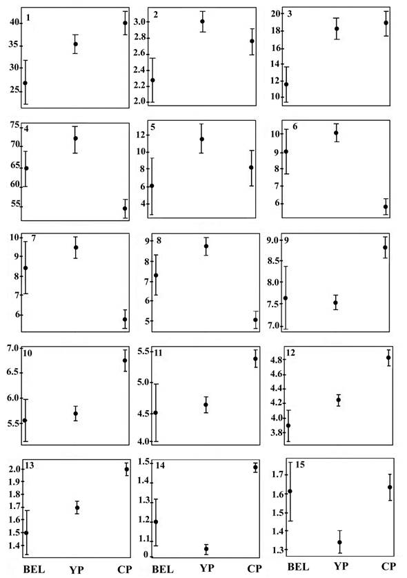 Figure 4 shows the graphs of the means and confidence intervals at 95% of the 15 morphological characters that showed the highest correlation with the first three principal components. The morphological groups characters, such as the length of the leaf blade, width of the inner perianth segment, length of the brachyblast, length of the accrescent style in the fruit, length and width of the fruit ,have means and intervals that do not overlap among the three morphological groups from Belize, Yucatán Peninsula, and the southern Pacific.