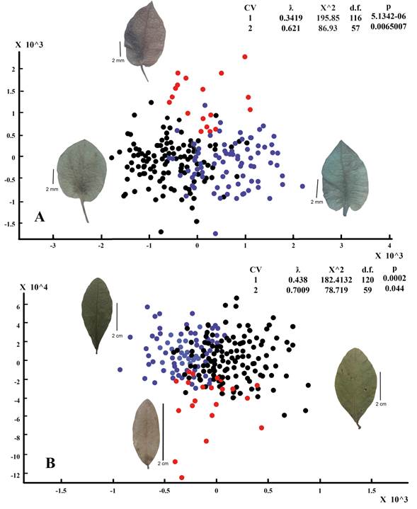 Both multivariate analyses of leaf shape separately from perianth segment shape found significant differences among the three geographic “a priori” groups (Figs. 5A-B). In the geometric morphometric analyses of tepal shape of the outer perianth segment there were two significant canonical axes (Fig. 5A). Regarding the analyses of leaf blade shape, there were also two different statistically significant axes (Fig. 5B). Partial shape deformations explained by each significant canonical axes help to detect regions in the contours where there are more differences among the three groups. In the specimens from Belize, the shape of the leaf blade varies from oblong, elliptical to obovate showing a reduction of the apex and the base to an obtuse form. This group contained the smallest leaf blades from 20 to 32 mm long and from 8 to 13 mm wide. The Yucatán Peninsula specimens tend to widen at the leaf base and the middle part, while the apex varies from rounded to slightly emarginated. The leaf blades of the individuals of the Pacific Coastal Plain tend to be reduced both at the base and in the middle portion while the apex varies from acute to acuminate. The segments of the outer perianth present a similar pattern of differentiation, so in the Belizean specimens the perianth lobe tends to widen to the right, while in the specimens of the Yucatán Peninsula the perianth lobe does it towards the left. Finally, Pacific specimens have symmetrical lobes showing a circular shape at the base of the floral segment.