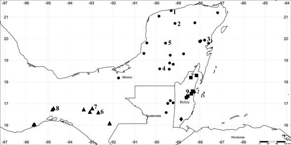 Distribution and ecology: Mexico (Campeche, Chiapas, Oaxaca, Quintana Roo, Tabasco, Yucatán), Belize and Guatemala (Petén). Tropical dry forest and savannas, 8-1350 m elevation.