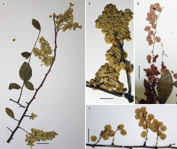Shrubs or trees 2-7 m tall; bark grey to dark brown fissured, young branches bivaricate, flexuous, sparse to dense pilose when young, glabrous when mature; trichomes simple; internodes 0.5-3 cm long; ochreas 1-2 mm long, deciduous, annular, glabrous to densely pilose; trichomes simple; leaves alternate, simple arising from the ochrea, or fascicled (2-3) arising on small vegetative shoots (brachyblasts); petiole 0.4-4 mm long, 1 mm wide, canaliculate, glabrous to densely pilose, dark brown; trichomes simple; leaf blades 2.7-9.5 cm long, (0.9-)2-5 cm wide, elliptic, oblong ovate to obovate, membranaceous to chartaceous, margin entire, apex obtuse, rounded to seldom emarginate, base cuneate to obtuse, abaxially glabrous to densely pilose; trichomes simple; nerves pinnate, not prominent; inflorescence 3-12 cm long, terminal; racemes single or paired, forming a compound panicle, on brachyblasts; rachis 3-14 cm long, glabrous to denseky pilose, trichomes simple; flowers hermaphrodite, born in fascicles of 2-6; ochreolae 1-2 mm long, lanceolate, membranous, sparse to densely pilosulose; trichomes simple; pedicels articulated, lower portion 1.3-1.9 mm long, upper portion 5-7.5(-8) mm long, pilosulose; perianth segments 6, 3 outer ovate-cordate, chartaceous, green to yellowish, sparse to densely pilose when young, glabrous or pilosulose when mature, nerves anastomosed, 3 inner subulate-lanceolate, acuminate, papery, glabrous to pilosulose, accrescent in fruit; perianth accrescent in fruit, 3 outer 6.5-8 mm long, 5-6.5(-7) mm wide, 3 inner 4-5 mm long, 1-1.5 mm wide, nerves reticulate; stamens 9, 6 outer inserted on a basal nectariferous disc, 3 inner arising opposite to ovary sulcus, filaments 2 mm long, anthers suborbicular, 0.5-0.7 mm long, versatile; ovary superior sessile, trigonous, dorsally compressed, 1-1.5 mm long, 0.5 mm wide, glabrous to pilosulose; styles 3, filiform, stigmas 3, capitate; fruit an achene, trigonous, 4-4.5(-5) mm long, 1.5(-2) mm wide, smooth, light brown, shiny, covered by the acrescent perianth segments; seed 1.