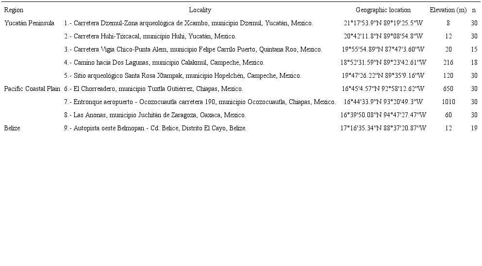 The preliminary review of the morphological variation and geographical distribution assessed from herbarium specimens (BM, CICY, MEXU, MO and UADY) allowed us to organize nine representative populations: five from the Yucatán Peninsula, three from the Pacific Coastal Plain, and one from Belize (Table 1). Additionaly, we carried out field work in Mexico to gather representative samples of the eight populations. These specimens were deposited in the herbarium UADY. Specimens collected in Belize were obtained from the herbaria BM and MO.