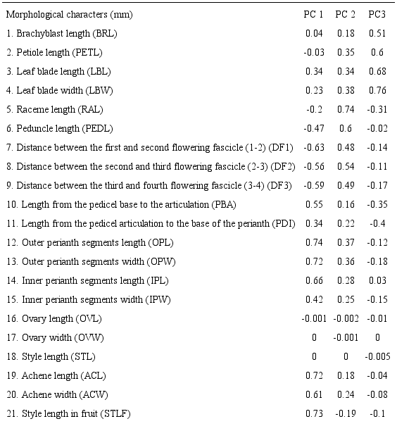 The PCA ordination analyses of the generalized variance in the distance data set showed that the first three components explain 52.9% of variance of the data (Fig. 3). These are those that turned out to be morphologically relevant according to the rule of the broken bar. The variables correlated with the first component were the distances between the floral fascicles (DF1, DF2, DF3), length and width of the outer perianth segments (OPL, OPW), the length of the achene (ACL) and the length of the accrescent style in the fruit (STLF). For the second component these were the length of the racemes (RAL) and length of the peduncle (PEDL) and for the third component the length of the petiole (PEL), as well as the length and width of the leaf blade (LBL, LBW) (Table 2).
