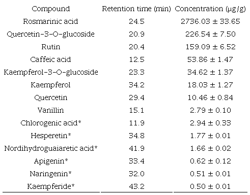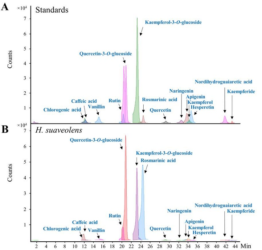 Once determined the antimicrobial activity of the methanolic extract of H. suaveolens leaves, we identified and quantified 14 phenolic compounds by a dMRM method using a simultaneous analysis with 48 authentic standards. The phenolic compounds identified by coelution with reference compounds were caffeic acid, vanillin, rutin, quercetin-3-O-glucoside, kaempferol-3-O-glucoside, rosmarinic acid, quercetin, kaempferol, chlorogenic acid, naringenin, apigenin, hesperetin, nordihydroguaiaretic acid and kaempferide (Fig. 1). Rosmarinic acid exhibited the highest concentration with a concentration higher than 2700 µg of compound per gram of dried weight (DW) material (µg/g), followed by quercetin-3-O-glucoside and rutin with concentrations higher than 100 µg/g DW (Table 2). Caffeic acid and kaempferol-3-O-glucoside exhibited a content higher than 30 µg/g DW followed by quercetin, kaempferol, vanillin, chlorogenic acid, naringenin, apigenin, hesperetin, nordihydroguaiaretic acid and kaempferide with concentrations less than 20 µg/g DW (Table 2).