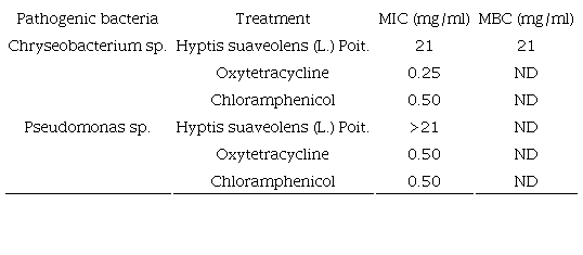 The antibacterial activity against Chryseobacterium sp. exhibited by the methanolic extract of H. suaveolens (Table 1, 3) is low compared to that exhibited by the methanolic extracts of L. cornoides and T. insignis against this bacterium (Ramírez-Reyes et al., 2019; Table 3). In addition, the antimicrobial activity of the methanolic extract of H. suaveolens leaves is low compared to that exhibited by the ethanolic extract of H. suaveolens tested against multiple pathogenic bacteria, including Pseudomonas aeruginosa (Schroeter 1872) Migula 1900 in a concentration of 75-100 µg/ml (Pachkore et al., 2011; Malar et al., 2012). The hydromethanolic extract of Hyptis atrorubens Poit. exhibited higher antimicrobial activity against P. aeruginosa, inhibiting the microbial growth in a concentration of 0.3-2.5 mg/ml (Abedini et al., 2013). However, the present work is the first report of the activity of H. suaveolens against the phytopathogenic bacterium Chryseobacterium sp., which represents a new venue to explore the biological activities of this species as potential control agent in important crops.