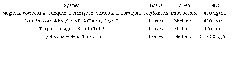 Hyptis suaveolens is commonly used in the traditional medicine in different countries in America, Asia and Africa, due to its properties as sedative, diuretic, antispasmodic, anti-inflammatory, anti-catarrhal, anti-cancer and antimicrobial agent, among others (Li et al., 2020; Mishra et al., 2021). In our study, we evaluated the antimicrobial activity of the methanolic extract against two phytopathogenic bacteria that affect economical important crops. We determined that the extract only exhibited activity at the highest concentration tested against Chryseobacterium sp., which is known for damaging Sechium edule (San Martín-Romero et al., 2014). Mexico, particularly the state of Veracruz, is the main world-wide producer and exporter of S. edule fruit, known as chayote, and its production is severely affected by phytopathogens (Olguín-Hernández et al., 2013; San Martín-Romero et al., 2014). Chayote is commonly used as ingredient in food, but has gained recognition for its nutritional and bio-functional properties (Vieira et al., 2019; Uuh-Narváez et al., 2021). Due to the economic importance of S. edule, we have conducted several efforts to search for safer and natural alternatives to control the phytopathogenic Chryseobacterium sp. (Ramírez-Reyes et al., 2018; 2019). The antimicrobial activity against Chryseobacterium sp. of extracts obtained from the aerial parts of 16 plant species were previously determined (Ramírez-Reyes et al., 2018; 2019). The methanolic extracts of Leandra cornoides (Schltdl. & Cham.) Cogn. and Turpinia insignis (Kunth) Tul. and the ethyl acetate extract of Magnolia vovidesii A. Vázquez, Domínguez-Yescas & L. Carvajal exhibited antimicrobial activity against Chryseobacterium sp. (Ramírez-Reyes et al., 2018; 2019; Table 3).