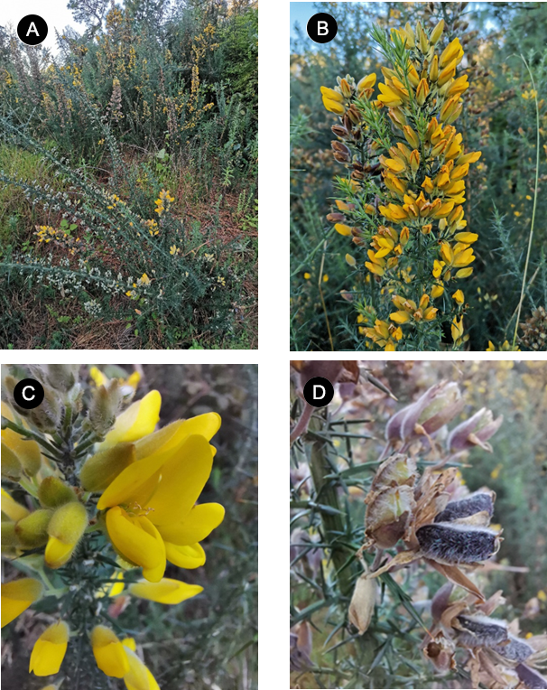 El registro y colecta de material botánico determinado como U. europaeus se realizó en México, estado de Morelos, municipio Huitzilac, específicamente en la comunidad de Tres Marías, cuyas coordenadas de colecta son 19°2'11.734' N, 99°13'47.475''O, donde la altitud es de 2700 m en una vegetación templada (alterada) de bosque de Pinus L. con algunos elementos de Quercus L. El material recolectado corresponde a las referencias de colecta de Rolando Ramírez-Rodríguez 5601 y Enrique Mosso-Mancilla s.n., a los que respectivamente se asignaron los registros 39787 y 39788 de la colección del Herbario HUMO de la Universidad Autónoma del Estado de Morelos. En el sitio de colecta se cuantificó una población conformada por 63 individuos. Las colectas fueron determinadas mediante claves taxonómicas (Cubas, 1984) y corroboradas con descripciones precisas (Clements et al., 2001). Este material colectado, aunado a las referencias bibliográficas y a la observación realizada en el área de registro, permite reconocer que U. europaeus es un arbusto perenne que puede vivir hasta 20 años, su altura es hasta de 3 m, su tallo grueso, verde, muy ramificado y armado con espinas primarias ramificadas en secundarias y terciarias de 1-4 cm de largo, rígidas y surcadas; raíz pivotante, gruesa, alcanza profundidades cercanas a los 50 cm; hojas perennes aciculares (espinosas), generalmente más cortas que las espinas, las hojas se reducen a escamas o filoides en forma de espina; flores hermafroditas 1.5-2.5 cm de largo, solitarias, en racimos o panículas, creciendo en las espinas primarias, a veces en espinas secundarias, las flores con pedicelos pubescentes, con una bráctea basal a veces no perceptible y dos bractéolas de 2-6 × 2-7.5 mm, más pequeñas debajo del cáliz; cáliz 10-15 mm de largo, persistente, aplanado, amarillo con tricomas gruesos, el labio superior hasta 6 mm de ancho; corola 15-18 mm de largo, amarilla, compuesta por una quilla, dos alas laterales y un estandarte, alas más largas que el cáliz; androceo formado por 10 estambres que forman un tubo por donde pasa el estilo, el ovario desarrolla 12 óvulos; fruto una legumbre negra peluda, vainas oblongas 1-2 cm de largo, con pelos oscuros cuando madura, sostenidas por un cáliz persistente; las vainas con 1-7 semillas, de color marrón, brillantes, lisas, duras y resistentes al agua (Fig. 1).