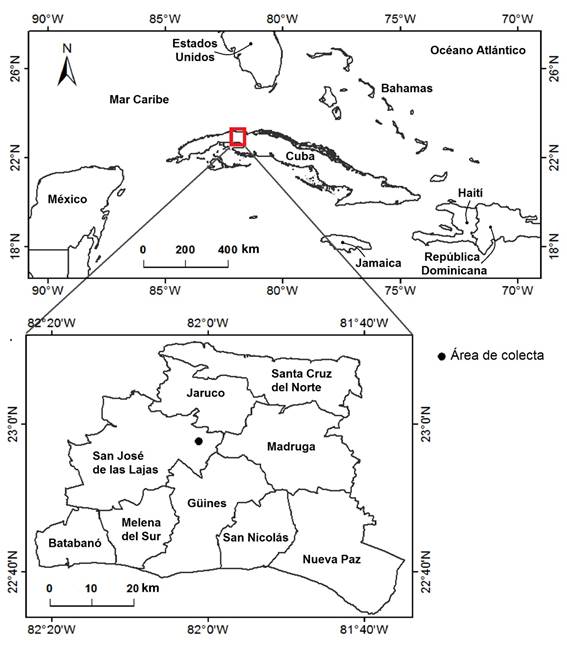 Los especímenes fueron recolectados en un bosque de vegetación secundaria en las cercanías del kilómetro 4.5 de la carretera al poblado de Casiguas (22o57'51.0''N, 82o01'11.1''O), perteneciente al municipio San José de las Lajas (Mayabeque, Cuba). El área se localiza a 148 m s.n.m., en la ecorregión de bosques húmedos, donde se encuentran pequeños arroyos con sustrato rocoso (Olson et al., 2001). La localidad de colecta se representa en un mapa elaborado con ArcGis v. 10.2 (ESRI, 2013) (Fig. 1).