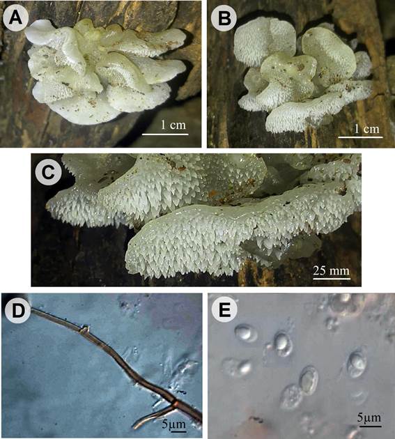 Basidiomas gelatinosos, lateralmente estipitados, imbricados; píleo de dimidiado a flabeliforme, 15-25 × 20-35 mm; superficie del píleo lisa a finalmente papilada, blanco grisácea (1B1) en estado fresco, amarillenta a amarillo grisácea al secar (4B3); margen entero; contexto delgado, gelatinoso, 5-8 mm de grosor, grisáceo (4B2); himenóforo hidnoide; acúleos cónicos, blancos (4A1), 3.3-8 × 1.3-4 mm; estípite corto, concoloro con la superficie del píleo, 4-10 mm de longitud; basidios globosos, hialinos, 10-14.6 × 7.5-11 µm, divididos longitudinalmente y formados por cuatro células, con cuatro esterigmas cilíndricos, 5-23 × 1.5-3 µm; basidiosporas de subglobosas a elipsoides, hialinas, lisas, inamiloides, indextrinoides, 6-7.8(-9) × (4-)4.4-4.9(-5.3) µm, Q=1.1-1.3, Qm=1.5; germinación no observada; hifas fibuladas, ramificadas, de hialinas a amarillentas, 2-3 µm de diámetro.