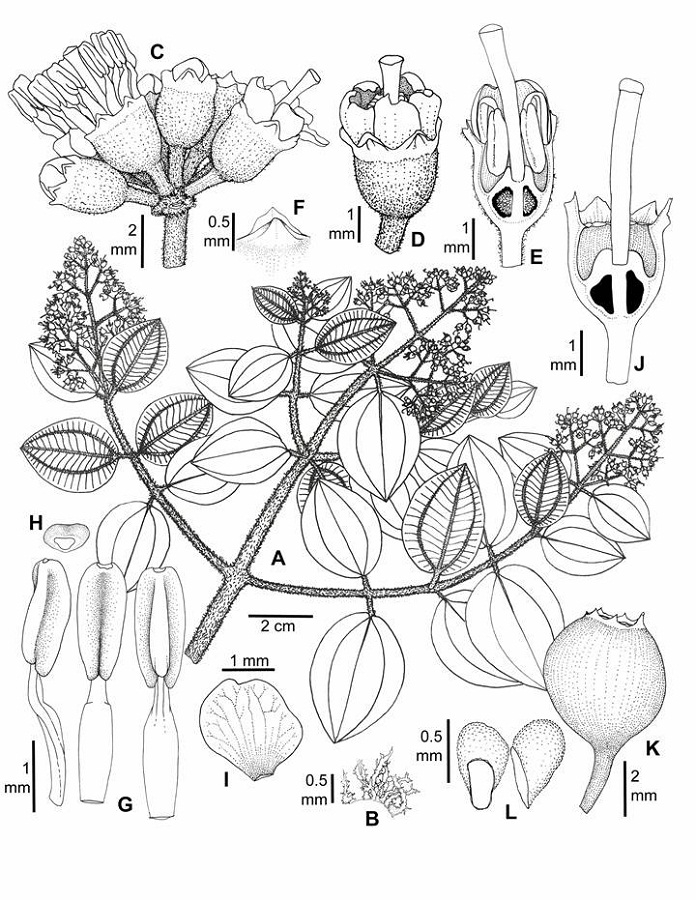 Se revisaron los ejemplares herborizados del herbario JBB del Jardín Botánico de Bogotá, Colombia. Para la descripción se realizaron medidas de las partes vegetativas e inflorescencias en material seco de herbario y utilizando un calibrador digital de 0.01 mm de precisión marca Mitutoyo (Serie 500, Neuss, Alemania). Las medidas de las partes florales se basaron en material seco rehidratado. Los tricomas se fotografiaron con una cámara MC190 HD (Wetzlar, Alemania) a partir material seco y posteriormente fueron clasificados con base en el atlas de tricomas de Melastomataceae de Wurdack (1986). Se sugiere su estado de conservación con base en el Área de Ocupación (AOO) y Extensión de Ocurrencia (EOO), utilizando para ello la herramienta GeoCat (Bachman y Moat, 2012) y aplicando las directrices y criterios de la IUCN (2017).