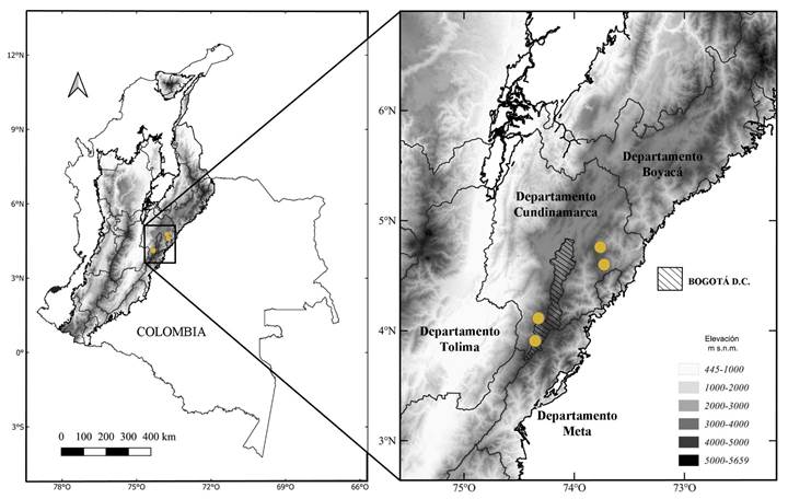 Distribución y hábitat: conocida solo del oriente y sur de Bogotá D.C., en la localidad de Sumapaz, y en los Parques Nacionales Naturales Chingaza y Sumapaz, entre 2950 y 3390 m de elevación (Fig. 2). Crece en zonas de bosque altoandino, en el interior del bosque en buen estado de conservación, pero también en los bordes.