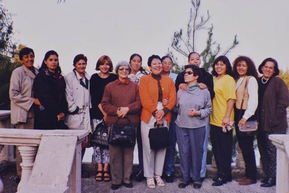 La “familia” siempre creciente de la maestra Graciela Calderón, en el año 1998, después de una comida en el restaurante Campestre Alemán, Arocutín, Michoacán. Primera fila, de izquierda a derecha: Maestra Graciela Calderón Díaz Barriga, Rosa Elena Murillo Guizar, Anita Rzedowski Calderón; segunda fila, de izquierda a derecha: Catalina Acosta, Ana Lilia Medellín, Lourdes de Patiño, Dra. Socorro González-Elizondo, Irene Anai Aguilar Murillo, Rosa Elena Aguilar Murillo, Rosa María Molina González, Minerva Martínez Calderón, Adriana Ivonne Silva Vargas y Biól. Rosa María Murillo Martínez (Crédito: Sergio Zamudio Ruiz).
