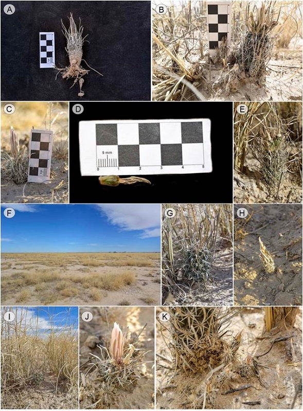 Our morphological comparison and literature revision supported that this is the first record for Sclerocactus papyracanthus in Mexico (Fig. 1). This record is located in the municipality of Ascensión, Chihuahua. In the first visit, four adult plants were sighted in two hours. In a second visit to the area, we found 38 plants in a single but extensive locality. According to our size classification, twenty-three individuals were catalogued as seedlings, two as juveniles, and 13 were adults. Most adult plants were flowering, and we also documented this phenomenon in two juvenile individuals (Fig. 1H).