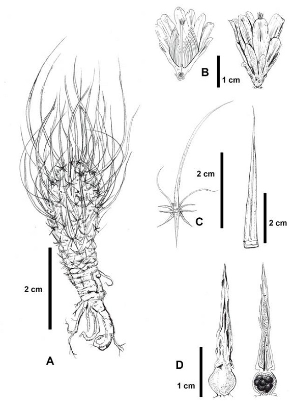 With the addition of S. papyracanthus to the flora of Mexico, there are now eight species of the genus recorded in the country, of which five are known for the state of Chihuahua (Korotkova et al., 2021). Sclerocactus papyracanthus is easily distinguished from any other species of the genus by the presence of long papyraceous and flattened central spines that resemble the dry leaves of the grasses. There is no other species of this genus that develops such long spines (Benson, 1981; Heil and Porter, 2001).