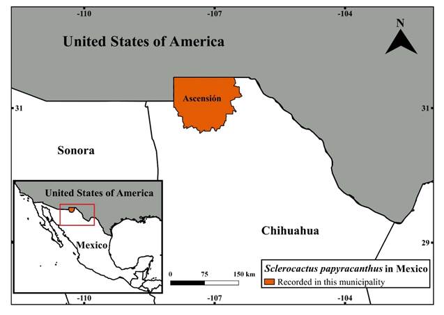 Some Sclerocactus species endemic to the USA have populations situated near the border with Mexico, as for example Sclerocactus polyancistrus Britton & Rose and S. papyracanthus (Engelm.) N.P. Taylor (Benson, 1982). None of the aforementioned species had been found in Mexico; nevertheless, S. papyracanthus was recorded approximately 100-150 km away from the border with Mexico (Powell and Weedin, 2004).