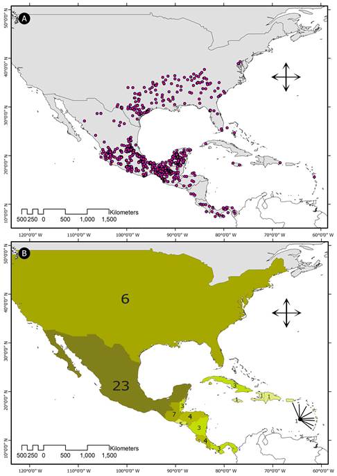 Of the 29 species distributed in the NA region, 23 of them are found in Mexico, followed by the United States of America and Guatemala with six species each. This diversity corroborates Mexico as the center of diversity in NA for the genus (Gould, 1997; Islas-Hernández et al., 2017a). In addition to this high diversity, about 80% of the species distributed in NA are exclusive to this region, with Mexico, the United States of America and Cuba as the countries with the highest number of endemic species with fourteen, three and two, respectively.