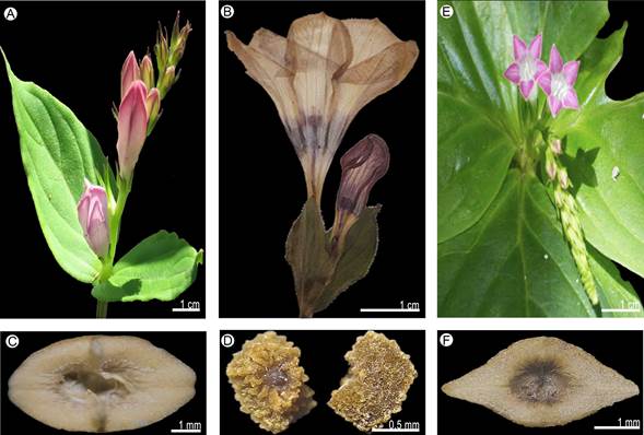 Herbs not branched, stem quadrangular, pubescent, without lignification; leaves opposite below the inflorescence, sessile, lamina ovate, membranaceous, 2.1-4.3 cm long; stipules present, linear; inflorescence terminal, monochasium cyme, 1-3 flowers, pedicellate (Fig. 18C); sepals green, lanceolate; corolla infundibuliform, 4.5-6 cm long, tube and lobes purple, lobes ovate; stamens inserted at the middle part of the corolla tube, included, filaments present; pollen in monads, sub-oblate, with medium polar area, 3-4 simple apertures, without margo on the colpi; stigma capitate, style glabrous; capsule glabrous, 7-8 mm diameter, metastyle present, smaller than the capsule, carpoatlas oblong (Fig. 18D), transversal ridge present; seed ovate, testa reticulate (Fig. 18E).