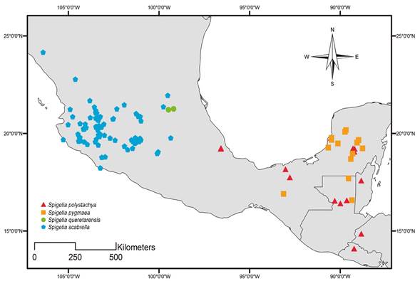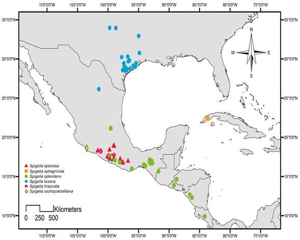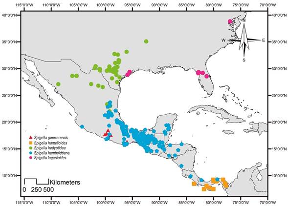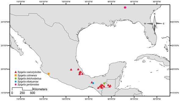 Conclusions: This study represents the first taxonomic treatment for the genus Spigelia that includes all the species of the central and northern regions of the Americas. The information collected in this work may be useful to be integrated into phylogenetic analyzes that help resolve the infrageneric relationships of the group. Likewise, the application of potential distribution modeling tools that would allow locating areas for future collection, as well as the development of biogeographic analyzes that help us understand the distribution patterns of Spigelia diversity along the continent.