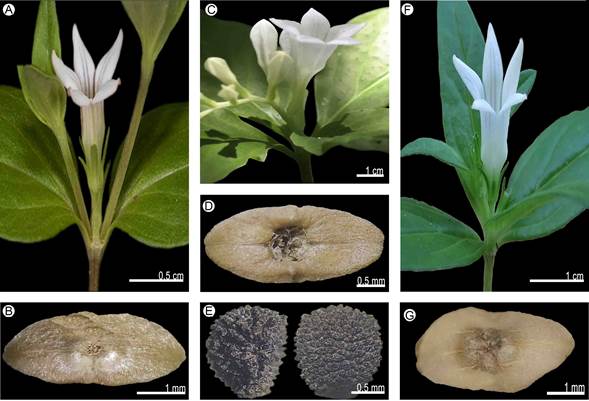 Herbs not branched, stem quadrangular, glabrous, without lignification; leaves pseudowhorled below the inflorescence, petiolate, lamina ovate, membranaceous, 6 cm long; stipules present, deltate; inflorescence terminal, scorpioid cyme, 10-15 flowers, pedicellate (Fig. 16E); sepals green with purple margin, deltate; corolla campanulate, 1-3 cm long, tube and lobes white, lobes deltate; stamens inserted at the middle part of the corolla tube, included, filaments absent; pollen in monads, suboblate, with large polar area, 3 simple apertures, with margo on the colpi; stigma capitate, style pubescent; capsule pubescent, 1.8-2.5 mm diameter, metastyle absent, carpoatlas oblong (Fig. 16F), transversal ridge absent; seeds quadrangular-compress, testa rugose (Fig. 16G).