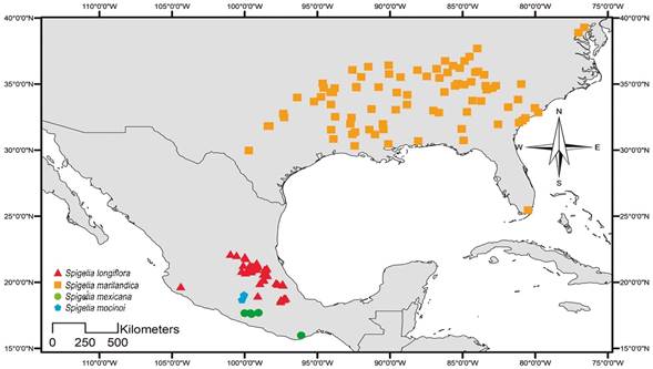 The genus Spigelia has a considerable diversity in NA, with about 30% of the species in this region, underestimated in previous works (Gould, 1997; Fernández-Casas and Huft, 2009; Villaseñor, 2016), distributed in tropical and subtropical zones, with an important presence along the coasts, from the United States of America to Panama. The genus inhabits mainly in tropical deciduous and sub-deciduous forests, with a high number of species also present in humid forests, mountain mesophilic forest and coniferous and Quercus forest (Gould, 1997; Fernández-Casas, 1998; Islas-Hernández et al., 2017a).