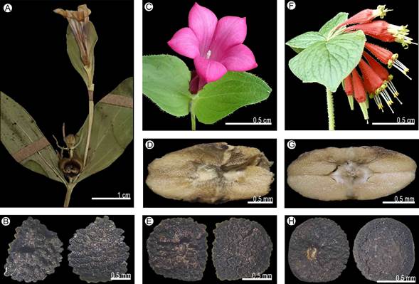 Herbs not branched, stem quadrangular, pubescent, without lignification; leaves opposite below the inflorescence, sessile, lamina ovate, membranaceous, 5-5.7 cm long; stipules present, linear; inflorescence terminal, scorpioid cyme, 7-18 flowers, pedicellate (Fig. 18F); sepals green, linear; corolla infundibuliform, 7-8.5 cm long, tube red, lobes yellow, lobes lanceolate; stamens inserted above the middle part of the corolla tube, exserted, filaments present; pollen in monads, suboblate, with medium polar area, 3 simple apertures, without margo on the colpi; stigma terete, style pubescent; capsule glabrous, 4.5-7.6 mm diameter, metastyle present, longer than the capsule, carpoatlas elliptic (Fig. 18G), transversal ridge present; seeds semi-spherical, testa reticulate (Fig. 18H).