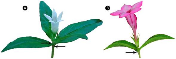 Vegetative characters: the species of the genus Spigelia present cylindrical or quadrangular stems, with opposite decussate leaves, with entire margins. In some species pseudowhorled leaves under the inflorescence are observed (Fig. 2); that is, the internode of the leaves below the inflorescence is shortened, giving the appearance of having four leaves at the same node. The lamina varies in shape, from elliptical, obovate, ovate, oblong, linear, to lanceolate. The texture can be membranous to leathery, glabrous, or pubescent. According to the classification of Hickey and Wolf (1975), the venation is eucamptodrome pinnate, similar in all species. The stipules are present at the nodes and vary in shape from linear to deltate, in a few cases they are absent; when present they are membranous, interpetiolar, and sometimes ciliated.