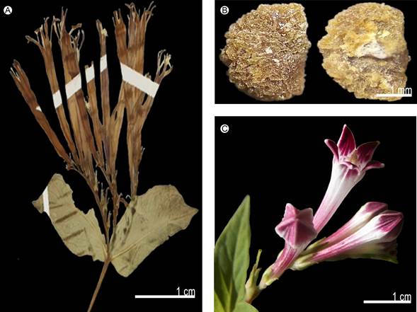 Flowers: the flowers, both in the family and in the genus, are pentamerous; the calyx is gamosepalous with deeply divided lobes, generally lanceolate, green, or green with purple apex. The corolla is gamopetalous, infundibuliform, hypocrateriform, tubular or rarely urceolate, with white, red or combined colors or purple stripes. There are five stamens, filamentous, sometimes sessile, or subsessile, attached to the corolla tube, exserted, or included, anthers basifixed or dorsifixed, ovate-sagittate, with longitudinal dehiscence. The ovary is superior, with two syncarpous carpels, the number of ovules ranges from 2 to 16; with an axillary placentation, the style is cylindrical, articulated near the base, the length of the style and its articulation may vary depending on the species. The stigma can be capitate or terete; in some species with abundant trichomes (Fig. 4), these have been reported for the secondary presentation of pollen (Erbar and Leins, 1999).