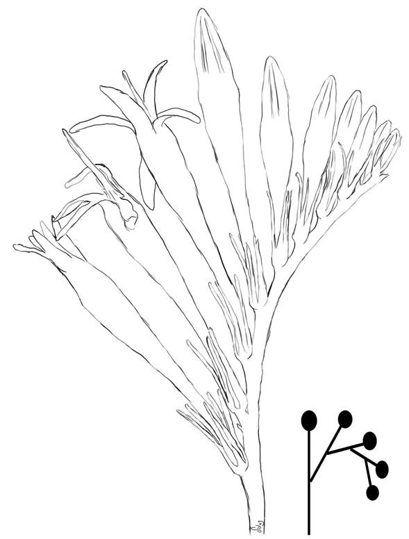 Inflorescences: the inflorescences, according to Weberling's (1989) classification, are a drepanium-type cincinnus (Fig. 3), since the flowers develop alternately on both sides of the main axis or monochasium. These can have a terminal or axillary position on the stem, with the presence of bracts and bracteoles.