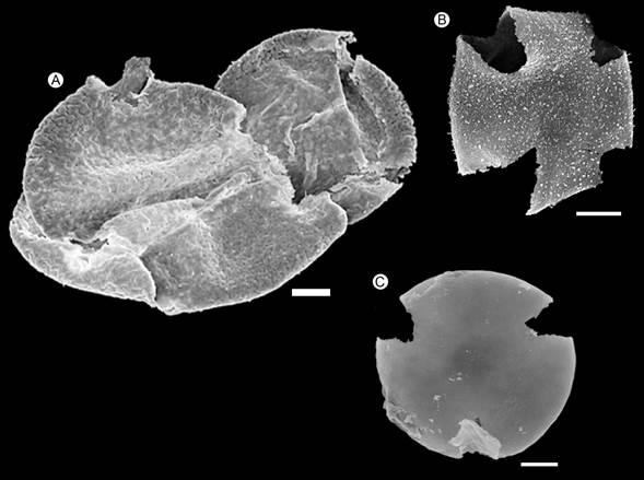 Pollen: the pollen grains are distributed in monads or tetrads, the shape is sub-spheroidal, occasionally oblate or prolate (Kremp, 1968), with tricolpate openings, sometimes tetracolpate, colpi occasionally with margo, exine 2-6 µm thick, with rugulated, verrucate or foveolate ornamentation (Fig. 5).