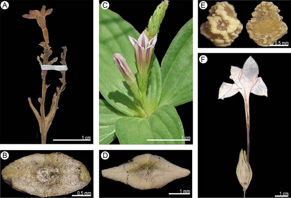 Herbs not branched, stem quadrangular, glabrous, without lignification; leaves opposite below the inflorescence, sessile, lamina oblong, membranaceous, 2.3 cm long; stipules present, deltate; inflorescence terminal, monochasium cyme, 1-3 flowers, pedicellate (Fig. 18A); sepals green, linear; corolla infundibuliform, 1.5-2.5 cm long, tube white with purple lines, lobes white with purple margin, lobes lanceolate; stamens inserted in the middle part of the corolla tube, filaments absent; pollen in monads, oblate-spheroidal, with medium polar area, 3 simple apertures, without margo on the colpi; stigma capitate, style glabrous; capsule glabrous, 5 mm diameter, metastyle present, longer than the capsule, carpoatlas oblong, transversal ridge absent; seeds semi-spheroidal, testa tuberculate (Fig. 18B).