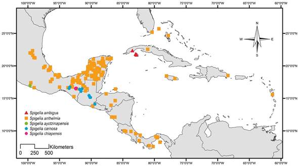 A high number of endemic species in the region, mainly in Mexico and Cuba, have restricted distributions that have been associated with the numerous biogeographic barriers in both countries (Fernández-Casas, 1998; Gould, 1999; Islas-Hernández et al., 2017a, b; Islas-Hernández and Alvarado-Cárdenas, 2020). Associated with these geographical conditions, several species, mainly endemic and microendemic ones, are known only from the type specimens (e.g., Spigelia ayotzinapensis, S. colimensis, S. dolichostachya, S. elbakyaniae, S. queretarensis, S. sphagnicola), have distributions that are threatened by anthropogenic activities (e.g., Spigelia chiapensis, S. gentianoides, S. guerrerensis, S. mexicana, S. mocinoi, S. trispicata, S. xochiquetzalliana) or have not been collected in about a century. Therefore, the updated knowledge of their morphology and distribution will allow the recognition of taxa, as well as the designation of areas that allow their conservation.