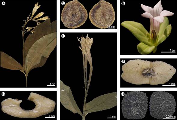 Herbs not branched, stem cylindrical, pubescent, without lignification; leaves opposite below the inflorescence, sessile, lamina ovate-lanceolate, membranaceous, 2.9-3.3 cm long; stipule absent; inflorescence terminal, scorpioid cyme, 3-5 flowers, pedicellate (Fig. 16-A); sepals green, linear; corolla hypocrateriform, 10 cm long, tube and lobes white, lobes elliptic; stamens inserted above the middle part of the corolla tube, included, filaments present; pollen in monads, oblate, with medium polar area, 3 simple apertures, without margo on the colpi; stigma capitate, style pubescent; capsule not seen; seeds not seen.