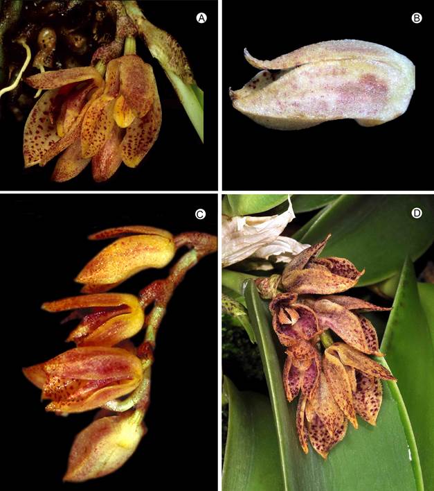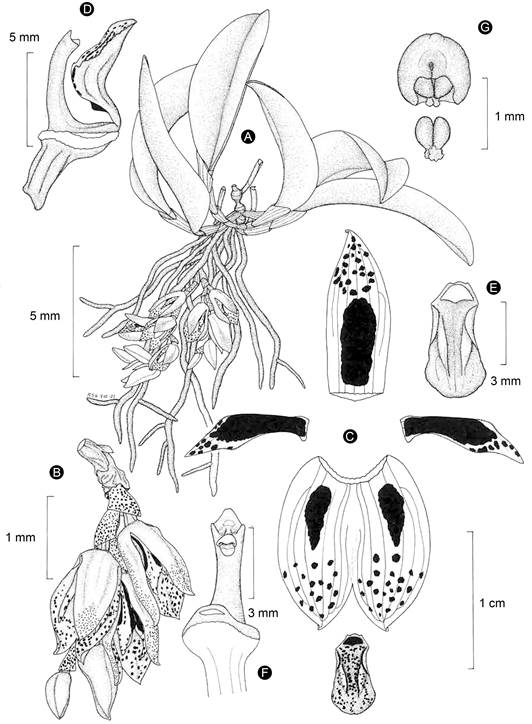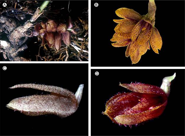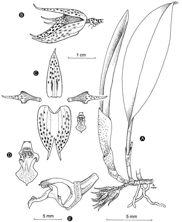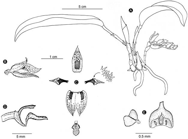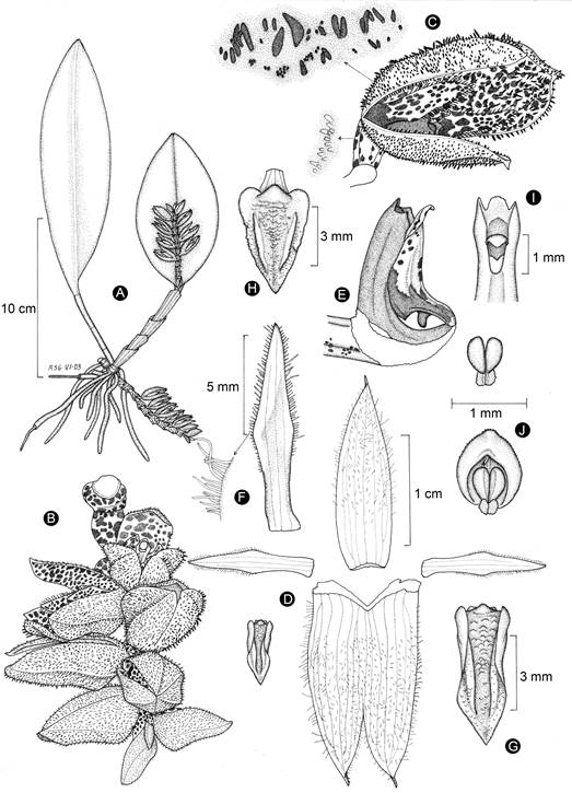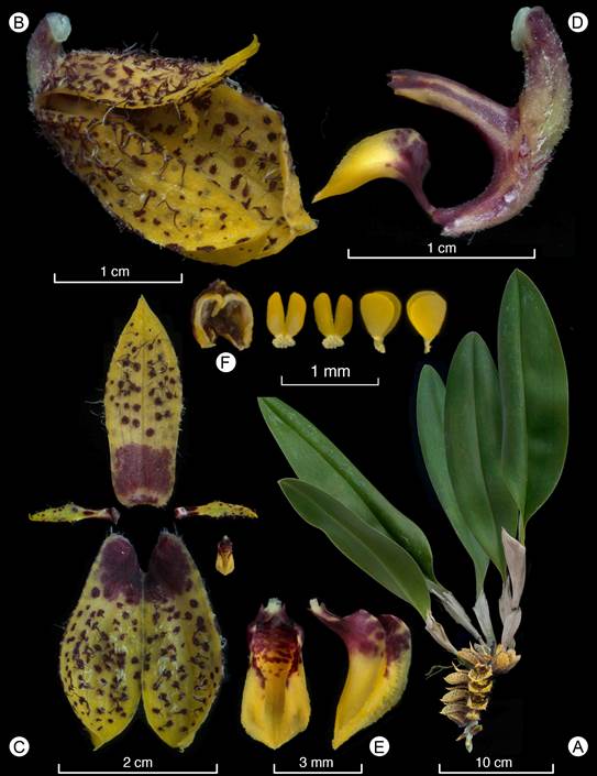 Rupicolous or occasionally epiphytic herb, up to 36.5 cm tall; roots 1.2-2 mm diameter; secondary formed by 4-5 internodes, 4-17.5 cm long, 1.6-3.5 mm diameter, covered by scarious sheaths; leaves 10-19 × 4-6 cm, elliptic, obtuse, recurved at the apex, sessile; inflorescence 5-6.5 cm long, up to 10 simultaneous flowers, generally from the basal node of the secondary stem and creeping, sometimes from the apex of the secondary stem and reclined on the adaxial surface of the leaf, peduncle 1-3 cm long, 2 mm diameter, with 2 (basal peduncle) or 5 (apical peduncle) obliquely infundibuliform bracts, obtuse, overlapping, 6-7.7 mm long, the apical peduncle covered at the base by a scarious spathaceous bract; floral bracts 7.9-8.7 mm long; flowers 17-21 mm long, tubular, semi-close, yellowish-brown to yellowish orange, densely purple dotted on both surfaces, petal yellowish-brown with purple dots, lip orange with purple dots, column and anther purple; sepals glandular-pubescent on both surface, hairs dark red, ciliate, apically mucronate, 5-7-veined, dorsal sepal 17-18.5 × 5 mm, lanceolate to oblong-lanceolate, subacute, lateral sepals 18.4-21.5 × 10-13.4 mm, fused along 2/3 of their length into an oblong-lanceolate, concave, deeply bifid synsepal; petals 11.2-12.3 × 2 mm, lanceolate-subrhombic, oblique, acuminate, 3-veined, ciliate along the upper 2/3; lip 5.5 × 2.1 mm when spread out, arching, 3-lobed, conduplicate, cordate-sagittate, acute, lateral lobes erect, rounded, lamina channeled between the submarginal calli, with a prominent, incurved, reddish callus near the base; column 5 mm long, 1 mm wide, slightly arching, with an incurved foot column, clinandrium 3-dentate; stigmatic cavity obovate, rostellum laminar, convex; anther 1 × 0.8 mm, ovoid-spheric, pollinia 0.6 mm long; ovary pyramidal, glandular pubescent, articled to a cylindrical pedicel; capsule not seen.