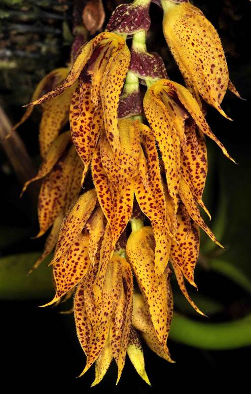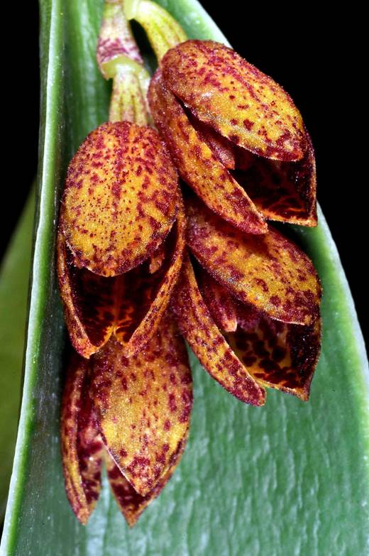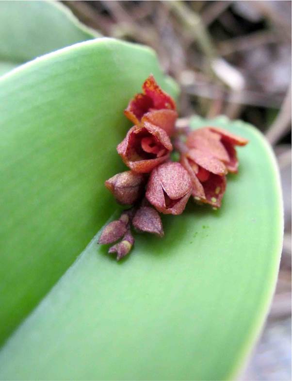 2a. Flowers sub-globose in form, whitish in background and densely dark red dotted; sepals scurfy ………………………………………. A. johnsonii (Ames) Pridgeon & M.W. Chase