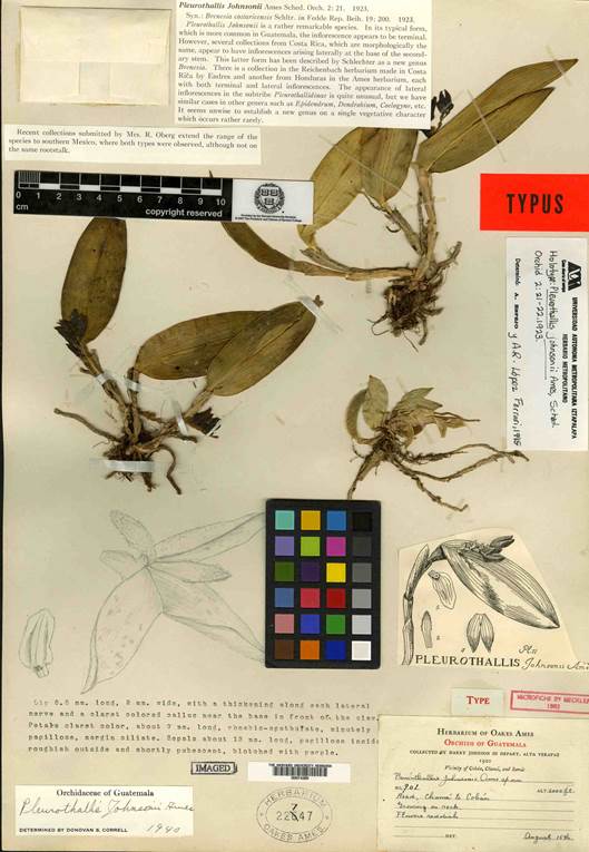 Garay (1956) considered Brenesia costaricensis as morphologically the same as Pleurothallis johnsonii, and indicated that “Recent collections submitted by Mrs. R(uth) Oberg extend the range of the species to southern Mexico…”, note attached to the holotype sheet of Pleurothallis johnsonii at AMES (Fig. 8). Those specimens have not been located at AMES. However, Mrs. Oberg and Robert Dressler visited San Cristobal de las Casas and from there they went to the Ocotal lagoons (northeast Chiapas), where they collected orchids (Oberg, 1959). Oberg’s specimens probably came from Los Altos of Chiapas and corresponded to A. rzedowskiarum sp. nov., which grows in the periphery of San Cristobal de las Casas. A photo of A. johnsonii was published, as Pleurothallis johnsonii, by Behar and Tinschert (1998: p. 112).