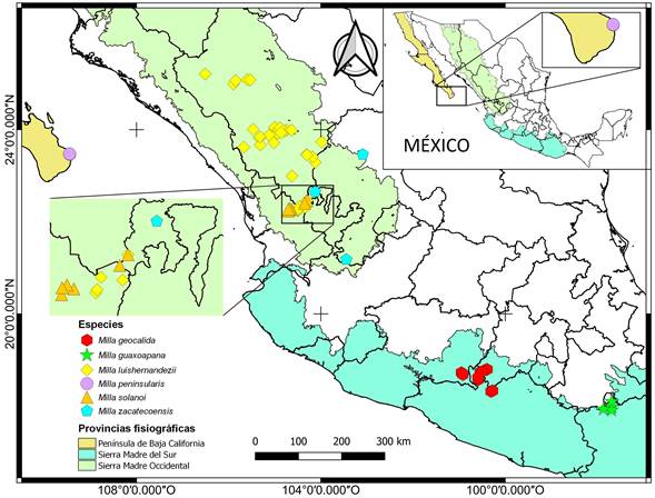 Con base en la delimitación y descripción de las especies aquí presentadas, se propone delimitar geográficamente a Milla biflora a la porción central de la Faja Volcánica Transmexicana y sur del Altiplano (Gutiérrez et al., 2017a; b). Sin embargo, consideramos que aún se requiere de más estudios, principalmente desde un enfoque filogeográfico que permita una mayor precisión en su delimitación.