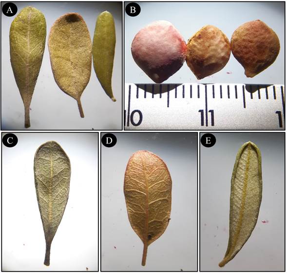 2b. Hojas generalmente solitarias o en fascículos de 2(3), peciolos 1-6 mm de largo, láminas ligeramente revolutas en los costados, haz verde pálido, envés tomentoso, no conspicuamente blanquecino, estilos presentes, semillas lisas a ligeramente onduladas. Endémica del norte de Sinaloa ……………… Castela juyyaania Pío-León & Carrillo-Gar.