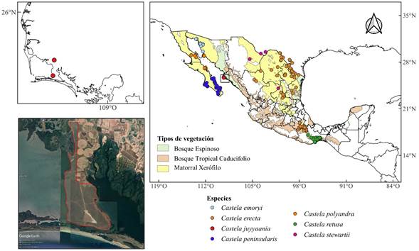 Conclusiones: Con la nueva adición, el género Castela llega a siete especies en México con cuatro endémicas, consolidándolo como su principal centro de diversidad. Los nuevos registros y la especie nueva aportan elementos valiosos para la conservación de los bosques secos altamente amenazados en México y Sinaloa.