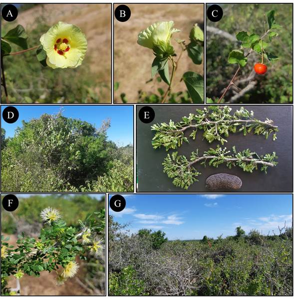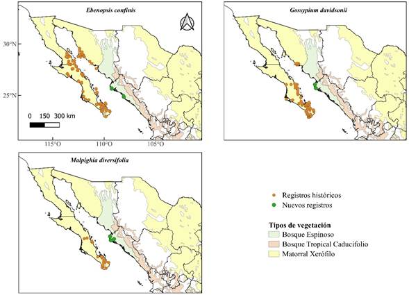 Ebenopsis confinis (Standl.) Britton & Rose, Gossypium davidsonii Kellogg y Malpighia divesifolia Brandegee son registrados por primera vez para la flora de Sinaloa (Figs. 5, 6), como parte de los elementos que comparten hábitat con C. juyyaania. Adicionalmente, se localizó un segundo registro de E. confinis en el islote Tortugas, hacia la costa central del estado, dentro de la Bahía Santa María y parte del Área de Protección de Flora y Fauna Islas del Golfo de California.