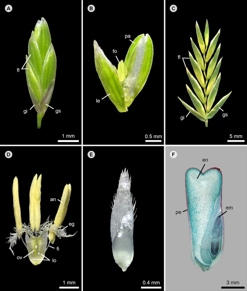 Respecto a su sistemática, las gramíneas son reconocidas como un grupo natural y homogéneo, debido a sus sinapomorfías morfológicas, que incluyen a las flores organizadas en unidades bracteadas llamadas espiguillas, el perianto representado por lodículas, frutos generalmente de tipo cariópside y embriones altamente diferenciados al momento de la dispersión de los frutos (GPWG et al., 2001) (Fig. 1). Se sugiere consultar los trabajos de Dahlgren et al. (1985), Clayton y Renvoize (1986), Watson et al. (1992), GPWG et al. (2001) y Kellogg (2015), para conocer más generalidades de la familia. Los primeros sistemas de clasificación del grupo se basaron en las características morfológicas (p. ej., Bentham y Hooker, 1883; Hitchcock, 1920, 1935), posteriormente se incorporaron fuentes de información como la anatomía, citología y embriología (p. ej., Dahlgren et al., 1985; Clayton y Renvoize, 1986; Watson et al., 1992), y más recientemente la evidencia molecular (p. ej., GPWG et al., 2001; Kellogg, 2015; Soreng et al., 2015, 2017, 2022). La propuesta de clasificación más reciente es la de Soreng et al. (2022), en la que se reconocen 12 subfamilias, 54 tribus y 109 subtribus.