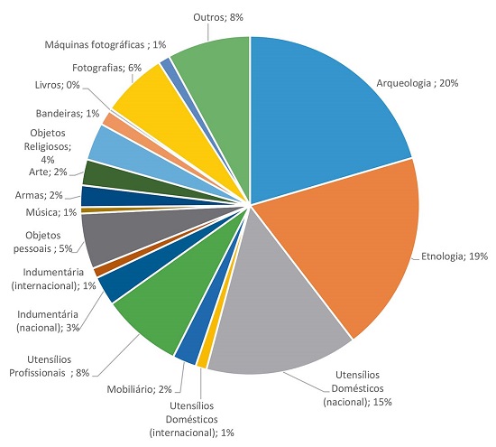 Assim, o Banco de Dados confeccionado a partir do PLR conformou as seguintes categorias de análises: arqueologia; etnologia; utensílios domésticos; utensílios profissionais; mobiliário; indumentária; indumentária nacional, indumentária internacional; objetos pessoais; música; armas; arte; objetos religiosos; bandeiras; livros; fotografias; máquinas fotográficas e, por fim, outros, para objetos que não se encaixavam em nenhuma categoria, como a placa japonesa e o estandarte.