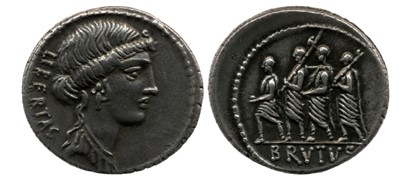 Na parte central inferior da gravura, encontra-se o reverso da moeda romana onde vemos o lendário Lúcio Júnio Bruto caminhando entre dois lictores, cada um segurando uma fasces, e precedido por um accensus. A moeda escolhida para emulação é carregada de significados republi- canos (FOX, 1968; DAVIS, 1988). Na mitologia fundacional romana, Bruto foi o responsável pela extinção da monarquia tornando-se o primeiro Cônsul e instaurando a res publica, o que acabou custando-lhe a vida. Bruto tradicionalmente foi reivindicado como um herói do republicanismo, cujo comportamento muitas das vezes deveria inspirar os novos republicanos setecentistas. Além dessa reprodução, sua imagem foi constantemente retratada ao longo do século XVIII, sendo talvez “Os lictores levando a Bruto os corpos de seus filhos” (1789), de Jacques-Louis David, seu clímax (RICHARD, 1994). Portanto, Macaulay associa-se à fundação da República Romana e com essa alusão recoloca como possibilidade a instauração da Commonwealth inglesa. O denário romano, escolhido do acervo pessoal de Hollis, mesclou de forma exemplar o ideal de liberdade e notória virtude republicana de Bruto à Macaulay (DAVIES, 2005). A analogia com o tempo republicano romano permitia a ela colocar-se como a garantidora das liberdades que, no cenário inglês, foi conquistada na luta contra o absolutismo dos Stuarts (AYRES, 1999).