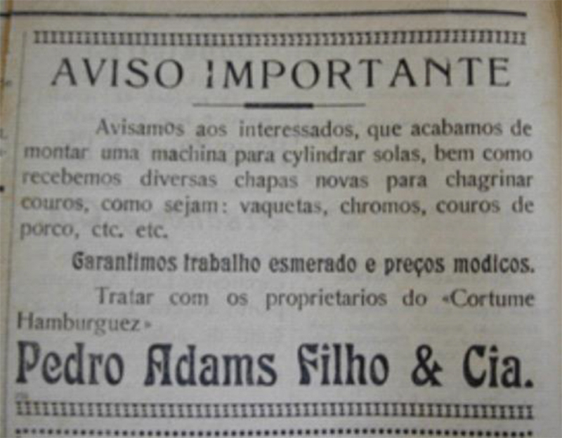 Para Lagemann (1986), a expressão “indústria de calçados” pode ser empregada somente a partir do início do século XX, pois, antes disso, a produção era artesanal. Baseados nesse autor, podemos conferir, à empresa de Adams o título de primeira indústria de calçados nos moldes modernos em Novo Hamburgo.