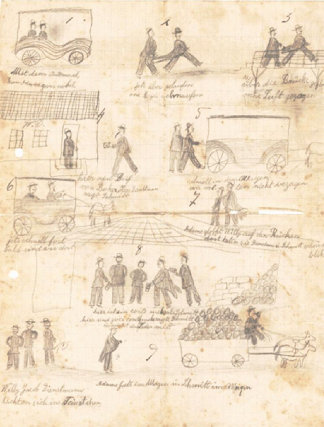Um dos empregados de Adams, que provavelmente estava aprendendo a falar alemão, presenteou-lhe com uma história em quadrinhos (Figura 3) que fazia menção ao automóvel e à carroça como meios de transporte do couro, fazendo referência a uma venda realizada por Pedro Adams Filho. Foi difícil traduzir a história e compreendê-la, mas, mesmo assim, achamos válido incluí-la neste artigo, uma vez que corrobora com as informações acerca da comercialização das mercadorias, além de ser uma fonte inédita e alternativa.