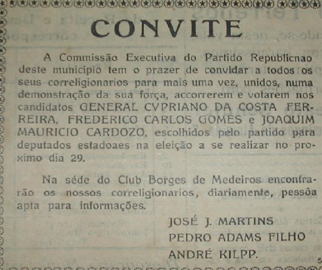 Depois da emancipação, Pedro Adams Filho continuou à frente da comissão executiva do Partido Republicano, conforme podemos observar no seguinte convite (Figura 4):