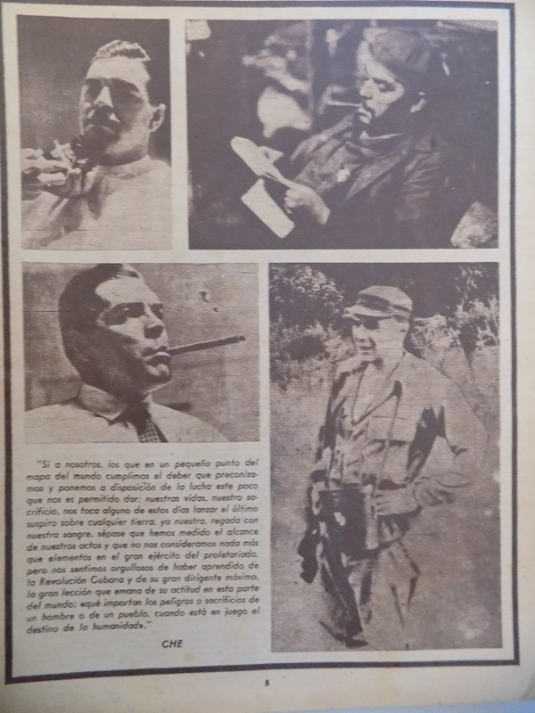 Observando as matérias que formam a revista, embora essas não sejam objeto de análise nesse momento, verifica-se a existência de sete textos escritos por Ernesto Che Guevara, além da sua carta de despedida, dirigida a Fidel Castro, escrita em 1965, a qual figura na primeira página. Nas páginas seguintes estão dois textos de Ernesto Che Guevara e a transcrição de um dos seus discursos, sem data, no qual ele escreveu sobre José Martín, intelectual cubano e herói da Independência de Cuba, que morreu na guerra, em 1895. Mantendo o olhar ao longo do periódico, identificam-se outros 15 textos, assinados por diferentes autores, e a transcrição de dois discursos de Fidel Castro, o primeiro realizado em 15 de outubro de 1967, na televisão e no rádio, no qual ele informa o povo cubano sobre a morte de Ernesto Che Guevara e declara a criação do Día del Guerrillero Heroico, a ser comemorado no dia 8 de outubro. E o segundo foi realizado na Plaza de la Revolución, na cerimônia fúnebre. Estes discursos são compostos por 19 fotografias e somam 32 páginas.
