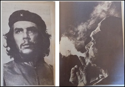 As palavras do herói aparecem junto com as fotografias (Figura 1) e podem ser percebidas como uma voz que vem revelar o caminho. Portanto, as palavras escritas ou faladas por Che Guevara constituem-se em uma característica identificadora do herói, bem como tendem a ser um poder de homens, no espaço da política. Ao observar essas fotografias, percebem-se alguns símbolos de masculinidade viril: o charuto, a barba, o livro, a boina, a farda e a arma, bem como são apresentados três momentos diferentes, vividos pelo fotografado, em Cuba, isto é, a sua atuação na guerrilha, antes de receber a boina de comandante guerrilheiro; usando a boina de comandante e atuando na organização do Estado após a vitória do movimento rebelde; e disfarçado como Adolfo Mena González, em 1966. A fotografia que se destaca está na parte superior da página e à direita, ocupando um lugar de proeminência na página, bem como figuram alguns símbolos: a boina, o charuto, a barba, a vestimenta militar e o texto.