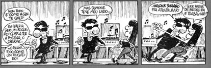 Na tira percebemos a autoironia, já que no primeiro quadrinho existe a vontade da personagem/autor de ser um roqueiro, ter postura, charme e qualidades compatíveis com os homens que interagem com este tipo de ritmo musical. Entretanto, ao chegar uma atraente mulher, a personagem esquece sua postura roqueira e se utiliza das canções de Waldick Soriano para tentar conquistá-la com passos de dança estilo bolero, ou bailão.