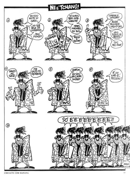 Em conjunto com estas informações, vemos a personagem dizer que se veste diferente para, no próximo quadrinho, dizer que é ímpar. A graça, então, fica quando no último quadrinho ele chama outras pessoas e percebe-se que são todos iguais. Interessante destacar que Angeli aparentemente não desenhou outras personagens iguais. Ao contrário, como informa Formaggini (2010), por diversos momentos o artista utilizou um processo de copiar e colar a primeira imagem da página com ajuda de uma máquina fotocopiadora, para que todas ficassem idênticas, afinal, esta era a piada. Todos os jovens acham-se únicos e são, na verdade, cópias entre si. E estas cópias, produzindo os sons monossilábicos “só é!”, indicando a falta de cultura e eloquência que é o oposto da intelectualidade que a personagem tenta apresentar, mostrando ao leitor quão falsa é a personalidade da personagem. Além disso, quando todos os demais “gêmeos” dizem o mesmo, fica caracterizada a falta de criatividade e individualidade da geração ali estereotipada.