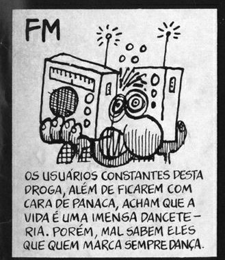 No quadrinho de Angeli, percebemos que a FM é tida como droga, como influência nefasta aos jovens do período. A piada crítica é sobre a forma como os jovens consumiam este tipo de música, “com cara de panaca” e achando que “a vida é uma imensa danceteria”. Angeli parece querer dizer que o simples fato de ouvir rádio afeta a capacidade de discernimento do jovem, que acaba absorvido por aquela programação e não consegue mais viver uma vida normal, ao mesmo tempo, é uma crítica à música executada nas FMs, ou seja, o rock.
