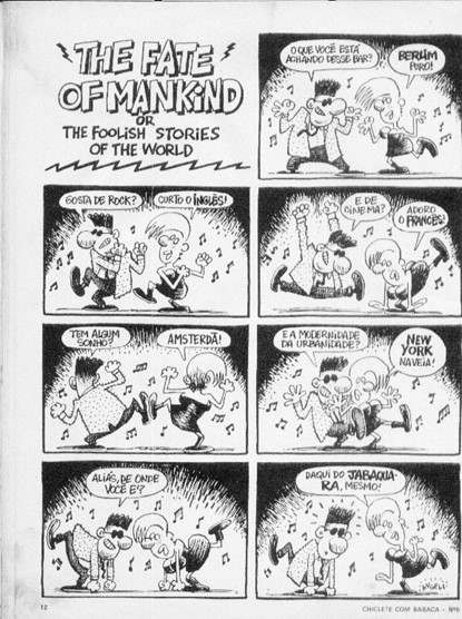 E depois de tantas referências a locais longínquos, ao ser perguntada pelo rapaz onde morava, a moça responde que morava no Jabaquara, bairro no centro sul da capital paulista. A piada encontra-se justamente aí, na inversão de expectativa do leitor, e na sua surpresa. Surpresa essa que é compartilhada pelo outro personagem, que é desenhado por Angeli como tendo uma espécie de susto somado à incredulidade da sua interlocutora ser tão provinciana. E quando voltamos ao título da página, percebemos que este provincianismo está declarado desde o início, no subtítulo The foolish stories of the world (as histórias mais bobas do mundo - em tradução livre).